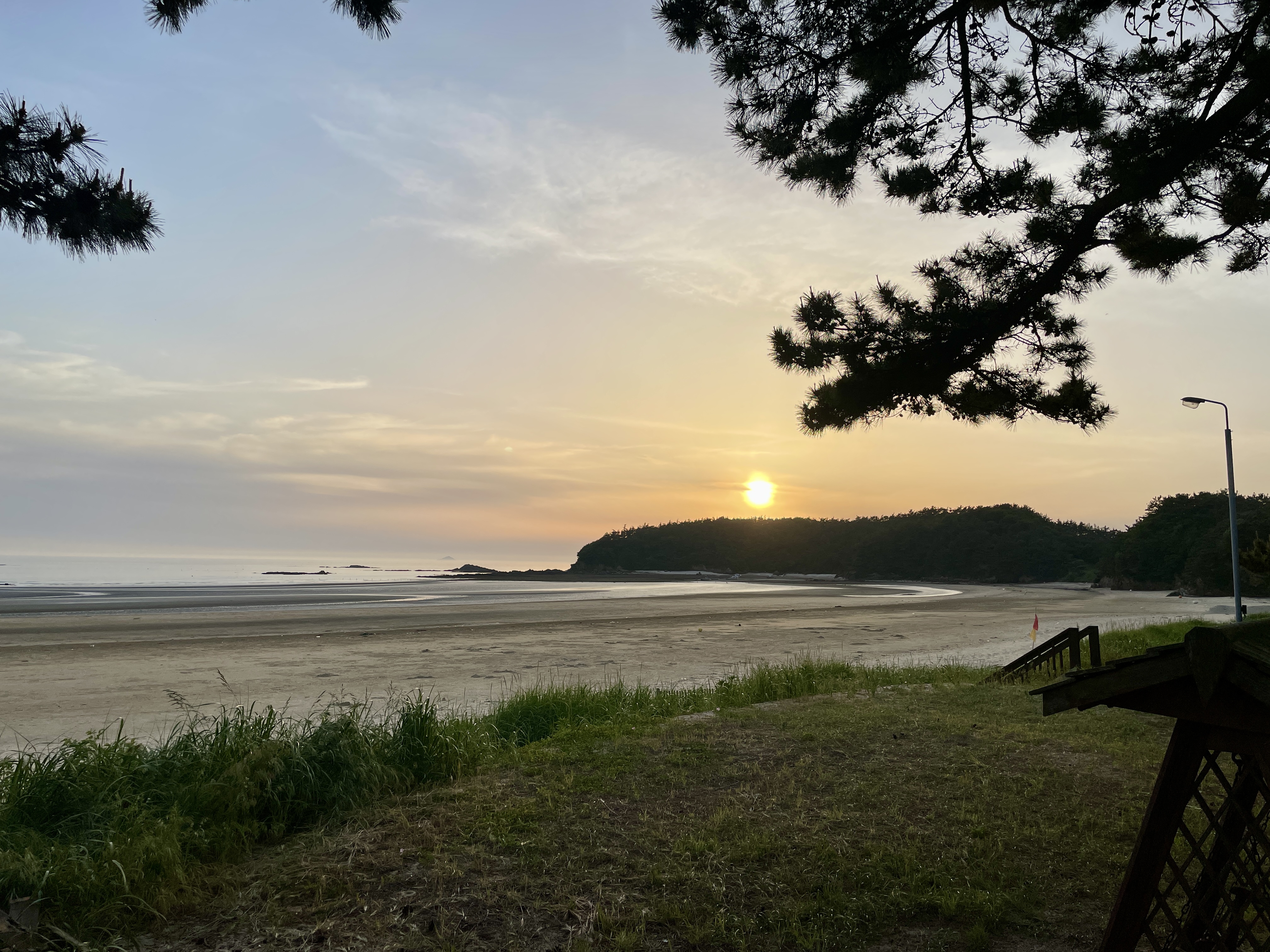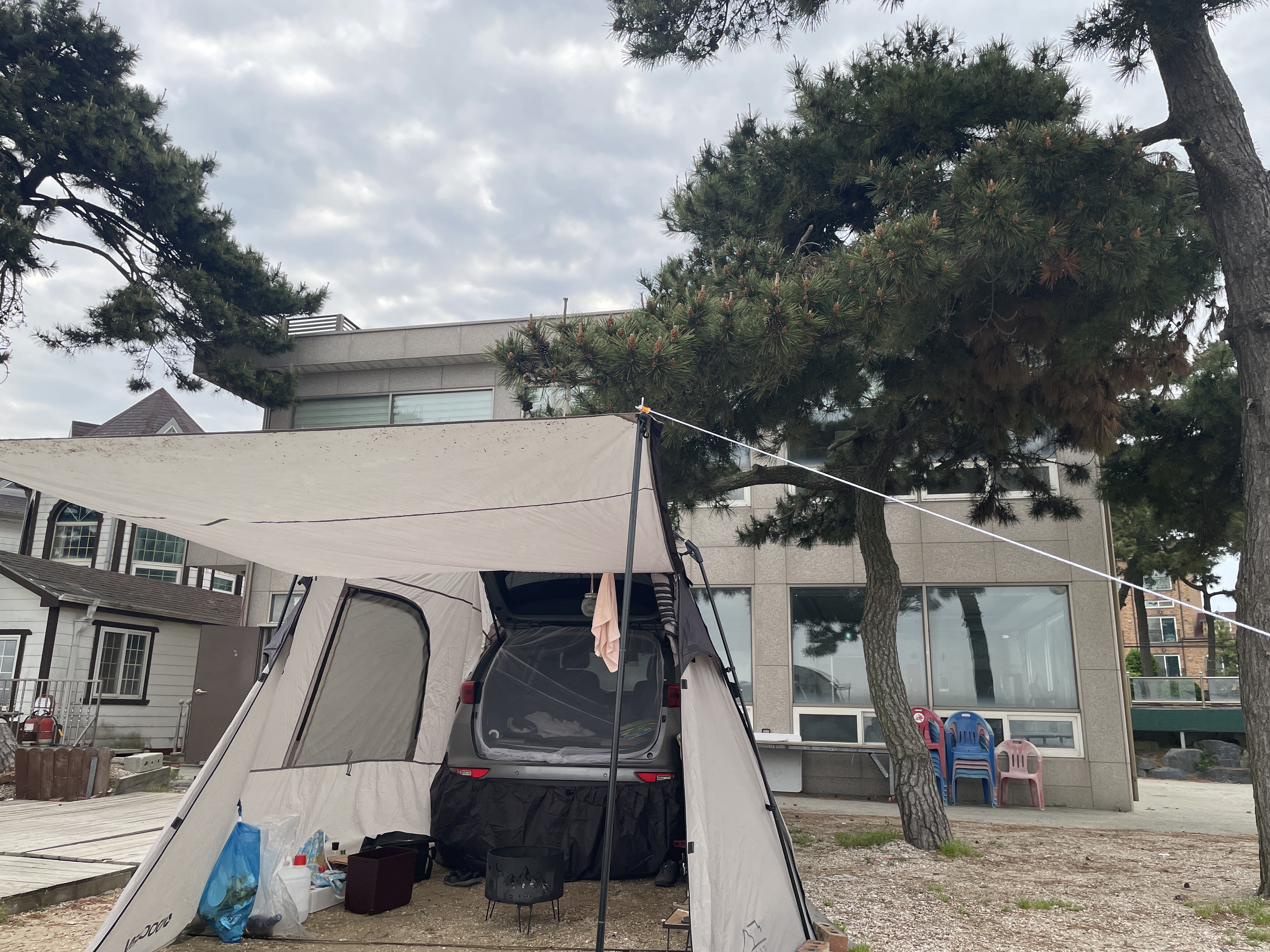 해변가까이 유료 캠핑장들이 몇 군데 있어서 경관좋고 시설 괜찮은 야영장 안 소나무 사이에 피칭
